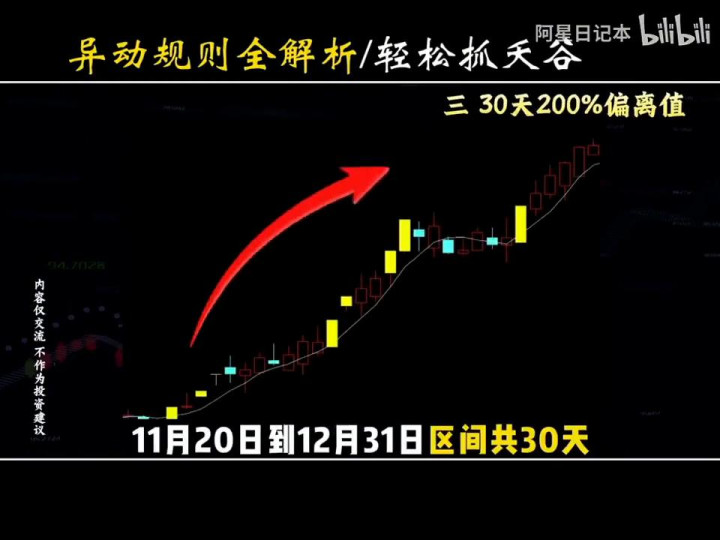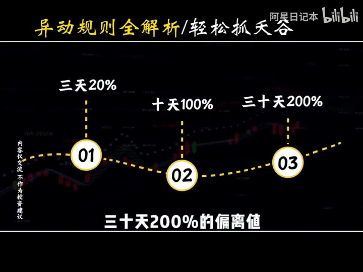 ·第一类规则:要了解异动规则,就必须了解异动偏离值。这偏离值可不是单纯涨跌幅,而是个股周期涨幅减去所属主板指数涨幅的结果。而异动偏离值具体又可以分为三大类:三天20%、十天100%、三十天200%的偏离值。每类触发的结果可是天差地别,所以一定要认真听。