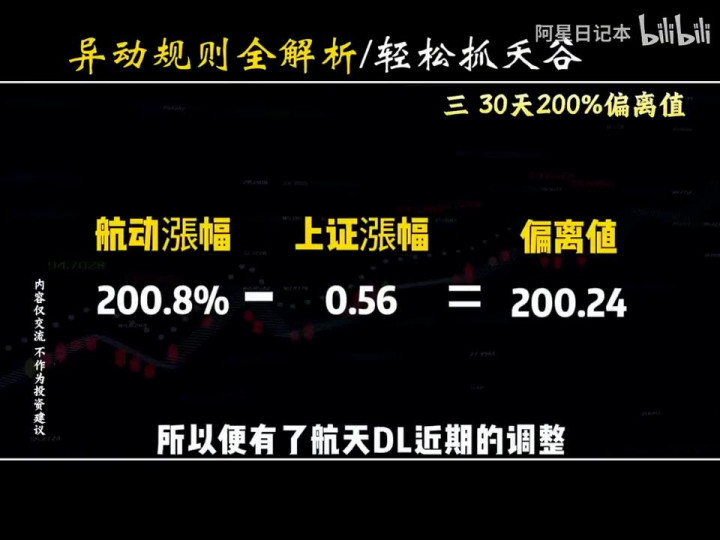 ·最后就是第三种,30天200%偏离值异动。以触发异动的航天动力举例,11月20日到12月31日区间共30天,航天动力区间涨幅达到200.8%,航动为上证主板票,上证在同期涨幅仅有0.56%,而航天动力涨幅减去上证的涨幅,最后偏离值是200.24%触发异动,所以便有了航天动力近期的调整。